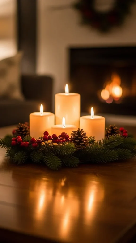 Group candles of different heights to create a soft glow. Use thrifted candle holders to save money. Stick to unscented candles if you plan to use many. Scatter them across shelves or side tables. Add small branches or ribbon pieces around the base for holiday style. Candlelight makes any room feel calm and cozy.